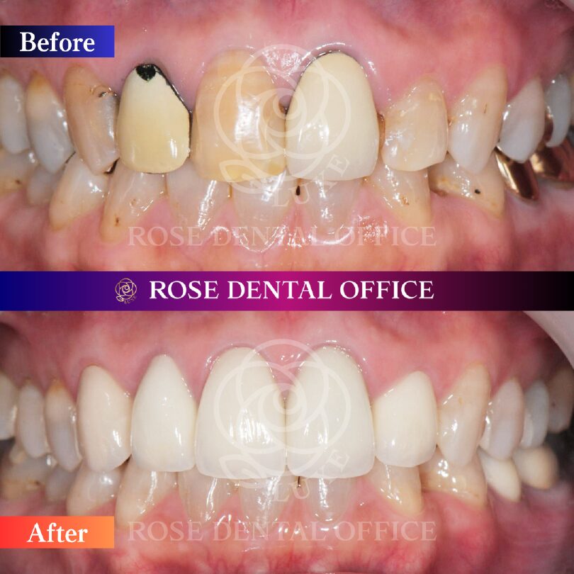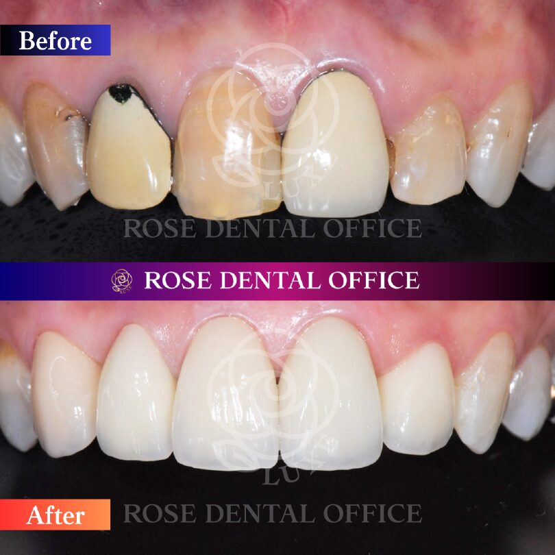 歯科に対して苦手意識があり、できるだけ少ない通院回数で治療を終えたいというご希望がありました。変色が気になっていた前歯には、根管治療を行なった後、歯の内部にはファイバーコア(土台)を築造して、審美性と耐久性に優れたジルコニアクラウンで自然で美しい仕上がりにしました。