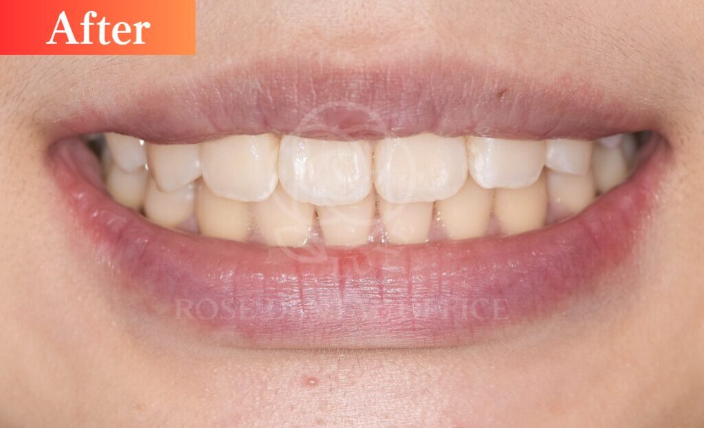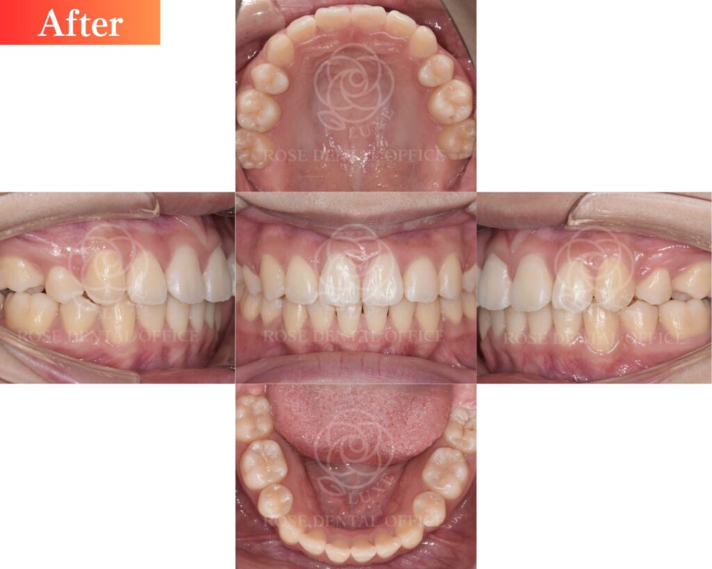 前歯の突出感だけではなく、正中(上と下の前歯の中心)と咬み合わせのバランスを整えて、前歯部の配列をより滑らかに整えました。