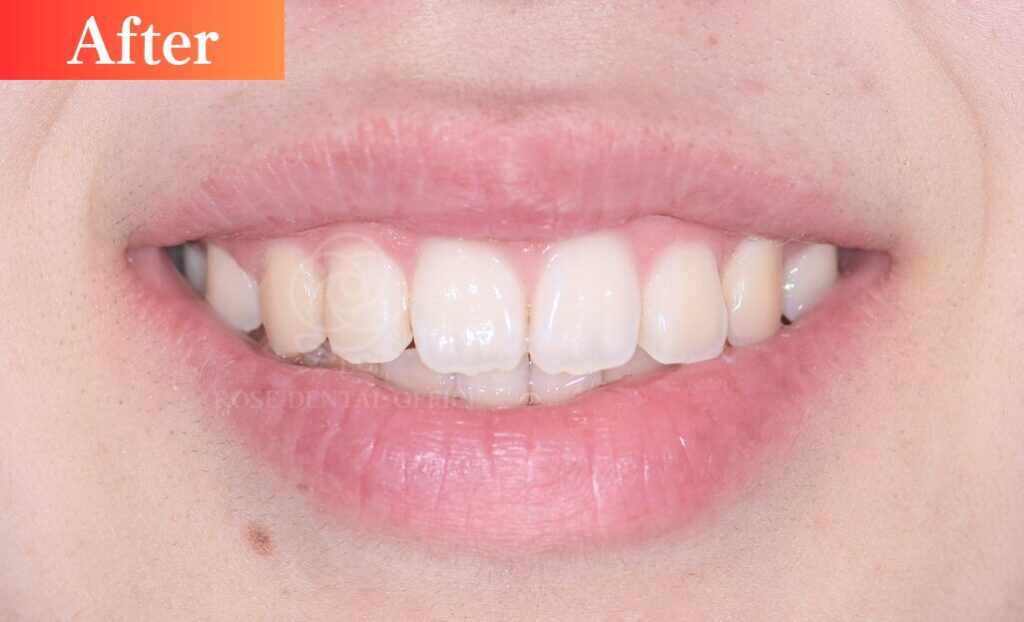 治療により、上顎前突と前歯部開咬が改善され、口唇や前歯の位置関係が整った事で、笑った時の歯茎の露出も軽減され、審美的バランスが改善されました。