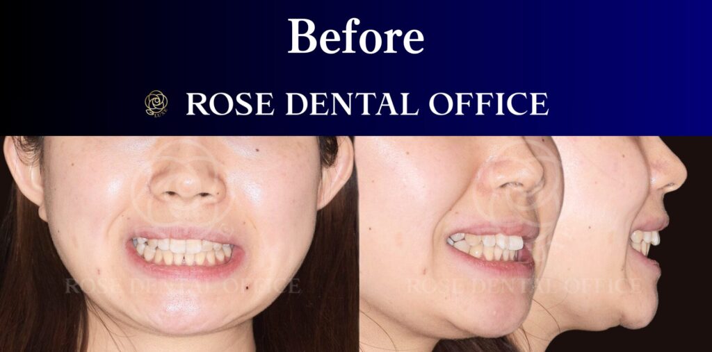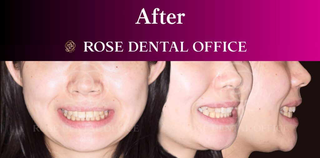 治療の結果、前歯のハの字の開きや横顔で気になっていた突出感が改善され、正面からも横からも自然で調和の取れた口元へと変化しました。