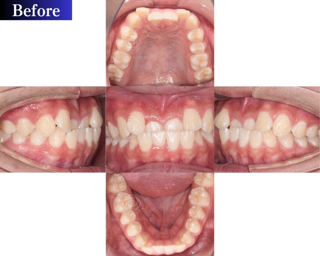 透明で目立ちにくいマウスピース型矯正装置を使用し、抜歯はせずに歯を少しずつ移動させながら、前歯の位置を唇側へ整え、上下の噛み合わせを改善しました。